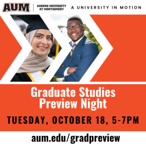 Thinking of pursuing a master’s degree? Learn more about Auburn University at Montgomery’s graduate degree programs tonight, from 5-7 p.m., in Taylor Center 221-223.